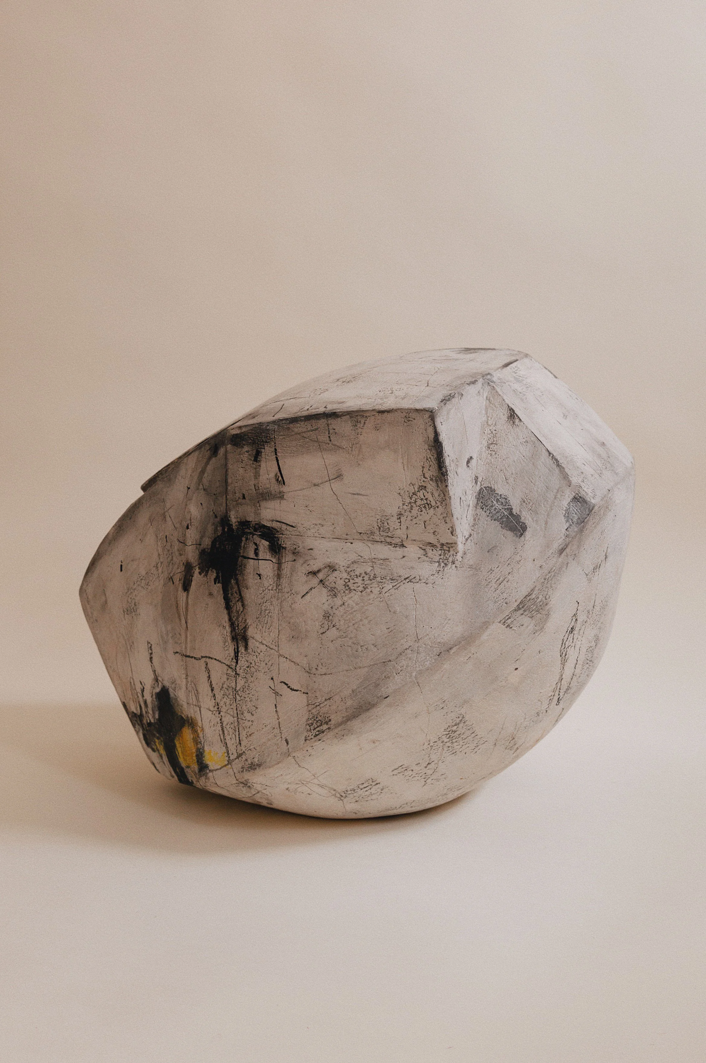 Large earthenware sculpture by Rebecca Appleby (b. 1979) decorated with white slip and chalk abstractions.